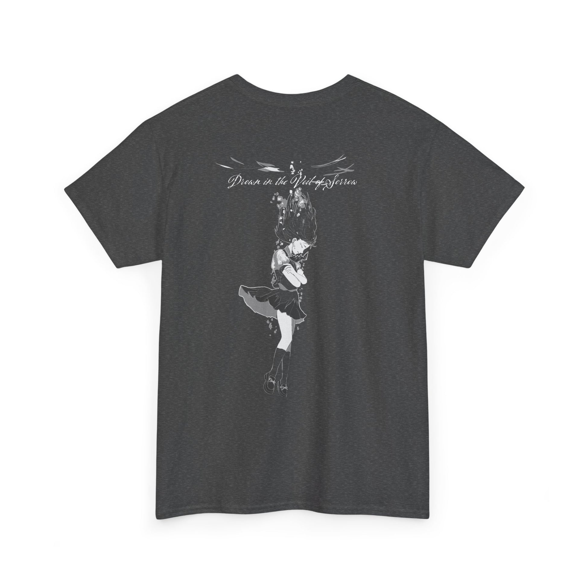 Unisex black t-shirt featuring front and back designs, inspired by our latest song, veil of sorrow